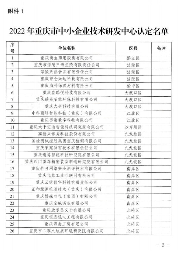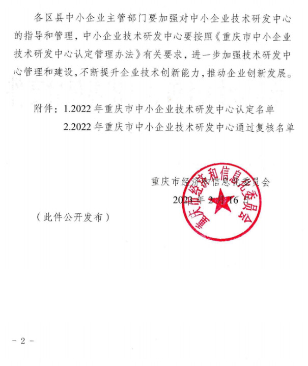 2023年2月16日,我公司被重慶市經濟和信息化委員會認定為“重慶市中小企業技術研發中心”,我公司自成立以來,一直致力于研發及技術創新,公司先后獲得國家高新技術企業、重慶市專精特新中小企業、重慶市中小企業信息化建設示范企業等榮譽。此后我公司會進一步加強技術研發中心管理和建設,迸發創新力量,實現創新驅動發展。